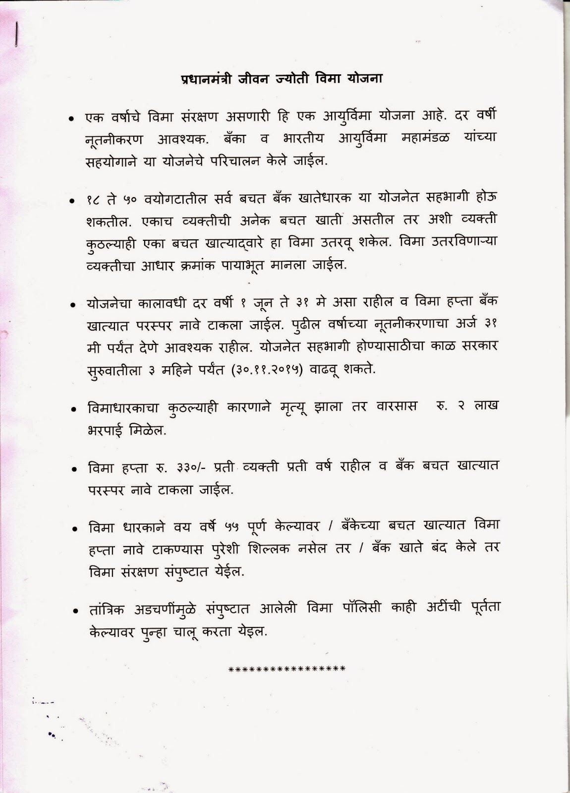 | 106 | केंद्र शासनाने दोन नवीन योजना सुरु केल्या आहेत... १) प्रधानमंत्री जीवन ज्योती विमा योजना रुपये ३३० वार्षिक हप्ता लाभार्थी वयोगट १८ ते ५० लाभ - मृत्यू झाल्यास २ लाख रुपये भरपाई अट - फक्त बँकेत खाते असणे आवश्यक कोणीही लाभ घेवू शकतो २) प्रधानमंत्री सुरक्षा विमा योजना रुपये १२ वार्षिक हप्ता लाभार्थी वयोगट १८ ते ७० लाभ - जखमी झाल्यास १ लाख रुपये व मृत्यू झाल्यास २ लाख रुपये भरपाई अट - फक्त बँकेत खाते असणे आवश्यक कोणीही लाभ घेवू शकतो दोन्ही योजनेचा लाभ तुम्ही एकत्रित रित्या घेवून रुपये ३४२ च्या वार्षिक हप्त्यामध्ये ४ लाख रुपयांचे संरक्षण मिळवू शकता. लवकरात लवकर तुमच्या बँकेशी संपर्क साधा.. |